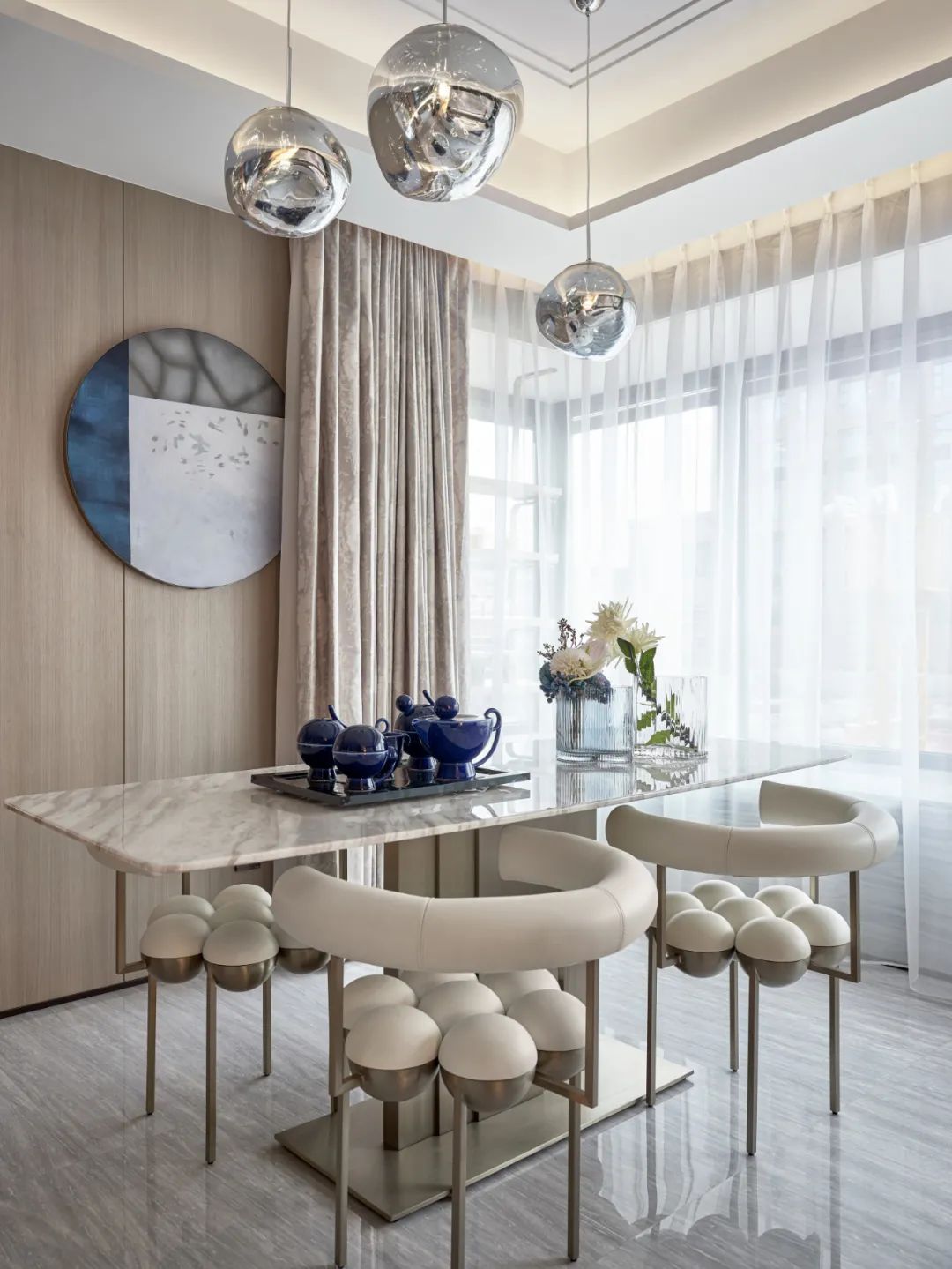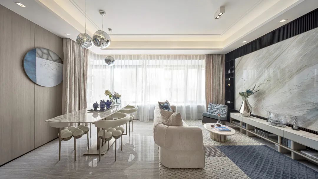 餐廳空間最大程度的地引用了客廳的自然光線,從早餐開始便與陽光相伴,使空間整體通透敞亮大氣嚴謹。