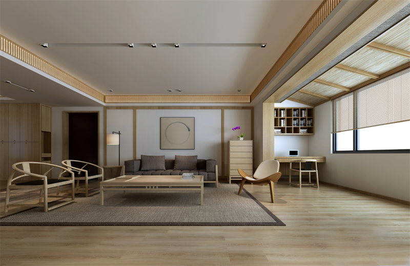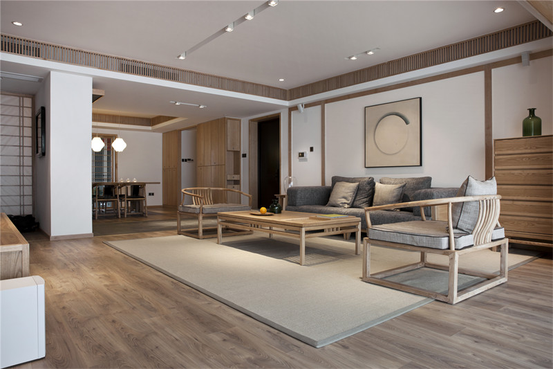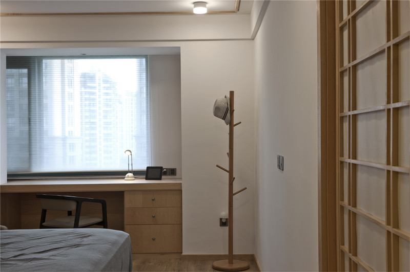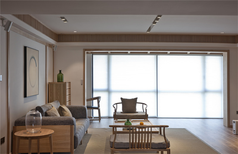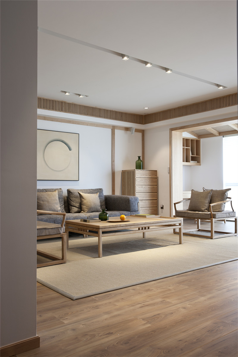 客廳灰色的棉麻布藝,米色的地墊和墻上不規(guī)則圓形的掛畫相呼應,完美演繹了和風,一種“有缺”的禪意。素色空間難免會顯得單調,巧妙地利用細節(jié)點綴能獲得很好的效果,如設計師在客廳放置的綠色玻璃瓶和綠植的融入能夠有效地增強空間活力。