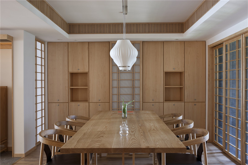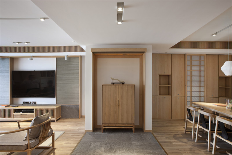 客廳電視墻的一側是茶室入口,進入茶室即可看見一整面的內(nèi)嵌柜子,其中擺放著屋主的各種收藏。靜坐于此,煮上一壺茶,會一會老友,就著茶香木香,談天說地,這才是生活原本的模樣。