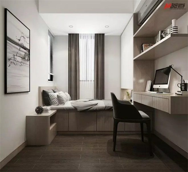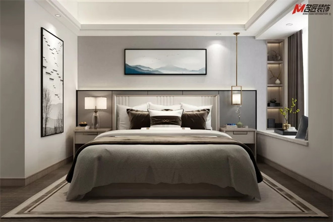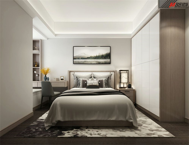 在公共空間的儒雅之外,設(shè)計(jì)師將濃重的筆墨留在了臥室。木飾紋面、精致的擺件,以和諧的比例出現(xiàn)在各處,淺灰雙人床、精美的邊柜、實(shí)用的衣櫥和床頭柜,無不展現(xiàn)出對細(xì)節(jié)的恰到好處。點(diǎn)睛之筆的壁畫和床頭燈飾呼應(yīng)了江南風(fēng)的小資情調(diào),滿懷青春的浪漫溫馨。